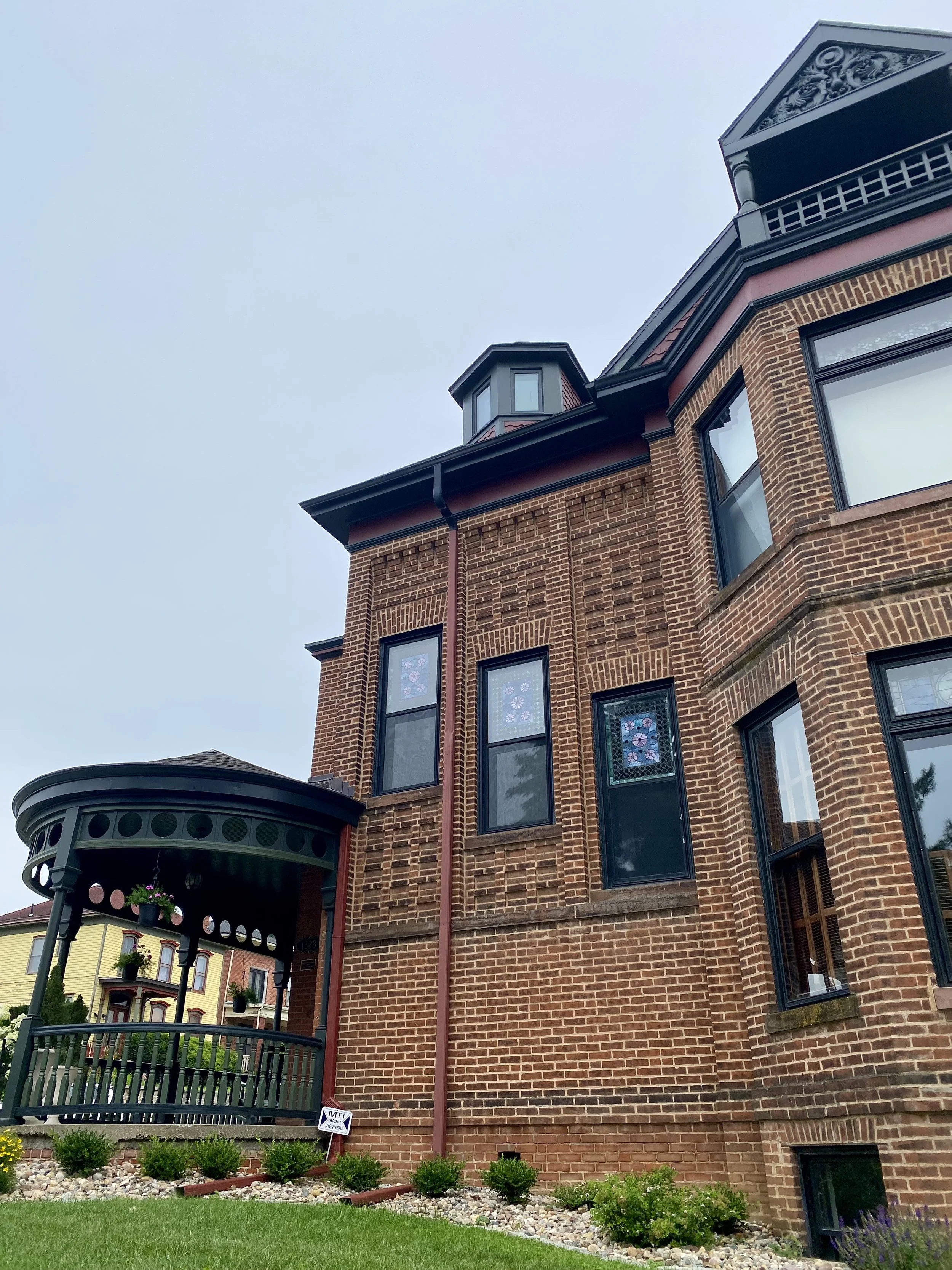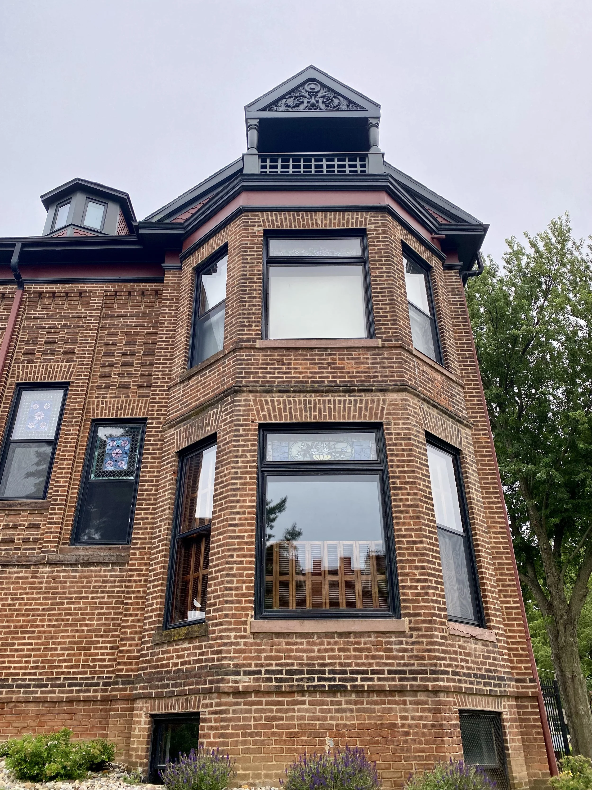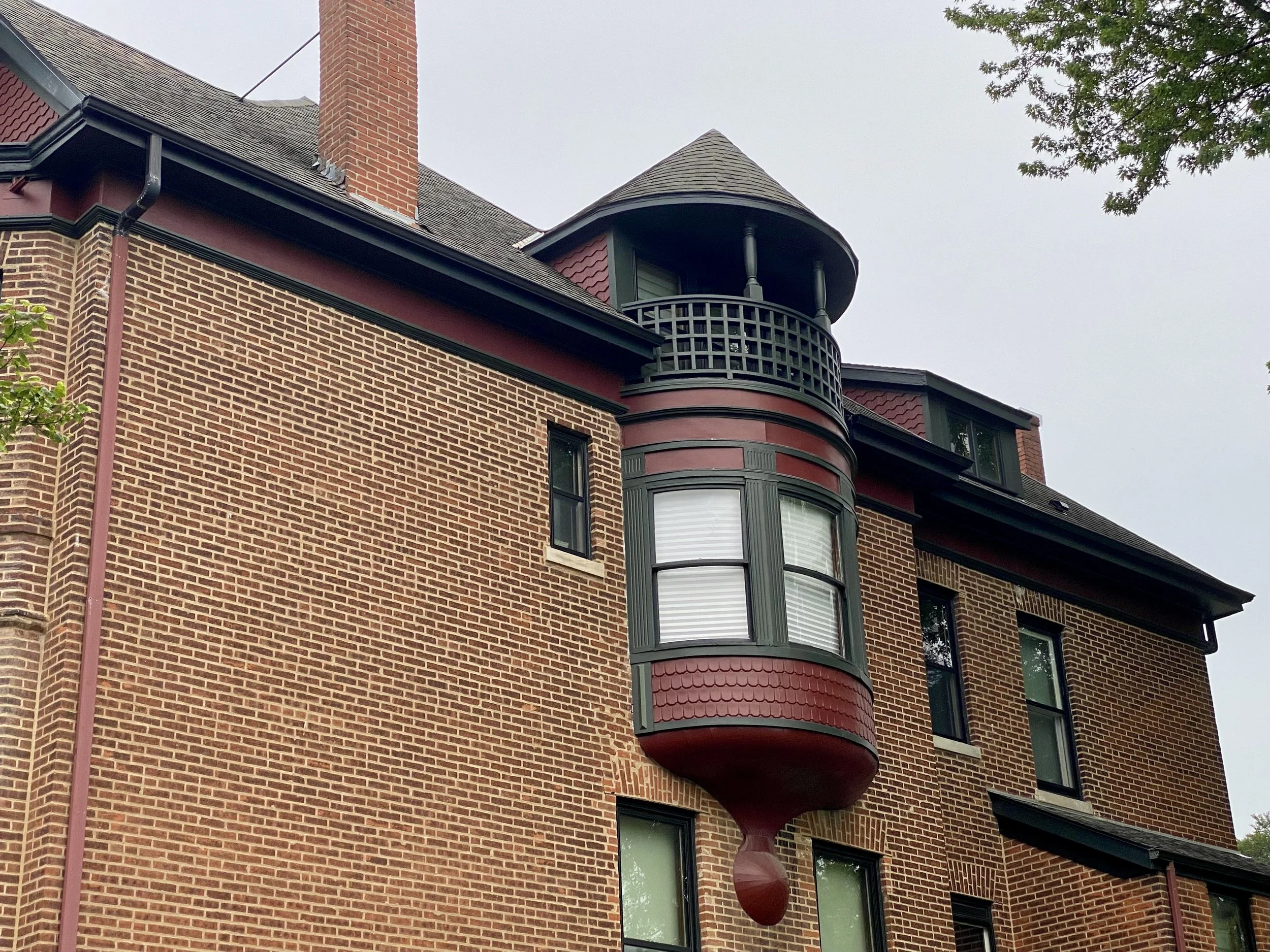 One of the principal architectural features of the house is the exterior treatment of an interior staircase with three stepped stained-glass windows and accompanying brickwork visible on the north side of the home. The west side of the home features a second-floor oriel with curved windows toped with the third-floor balcony that has been reconstructed from the original blueprints.