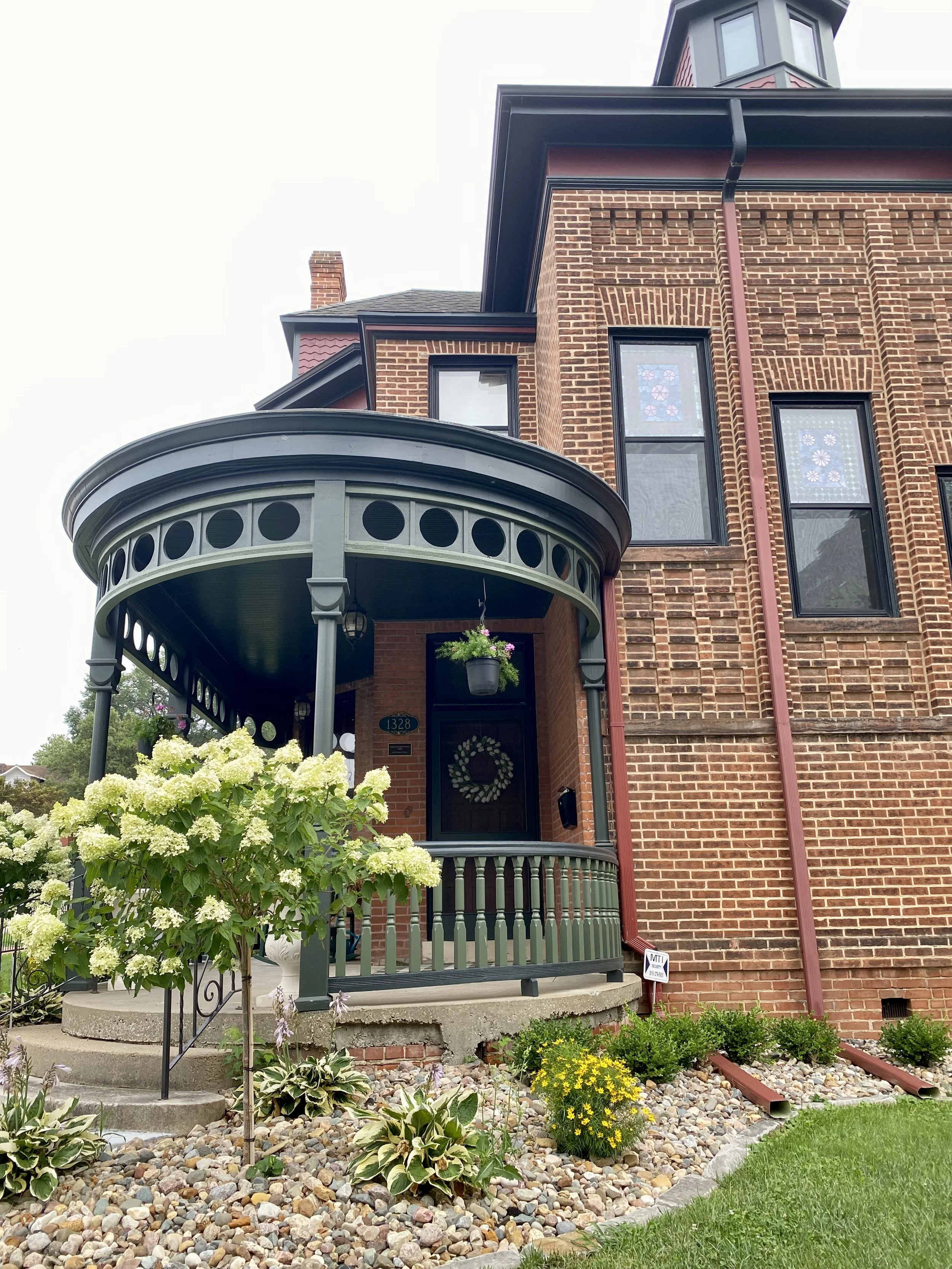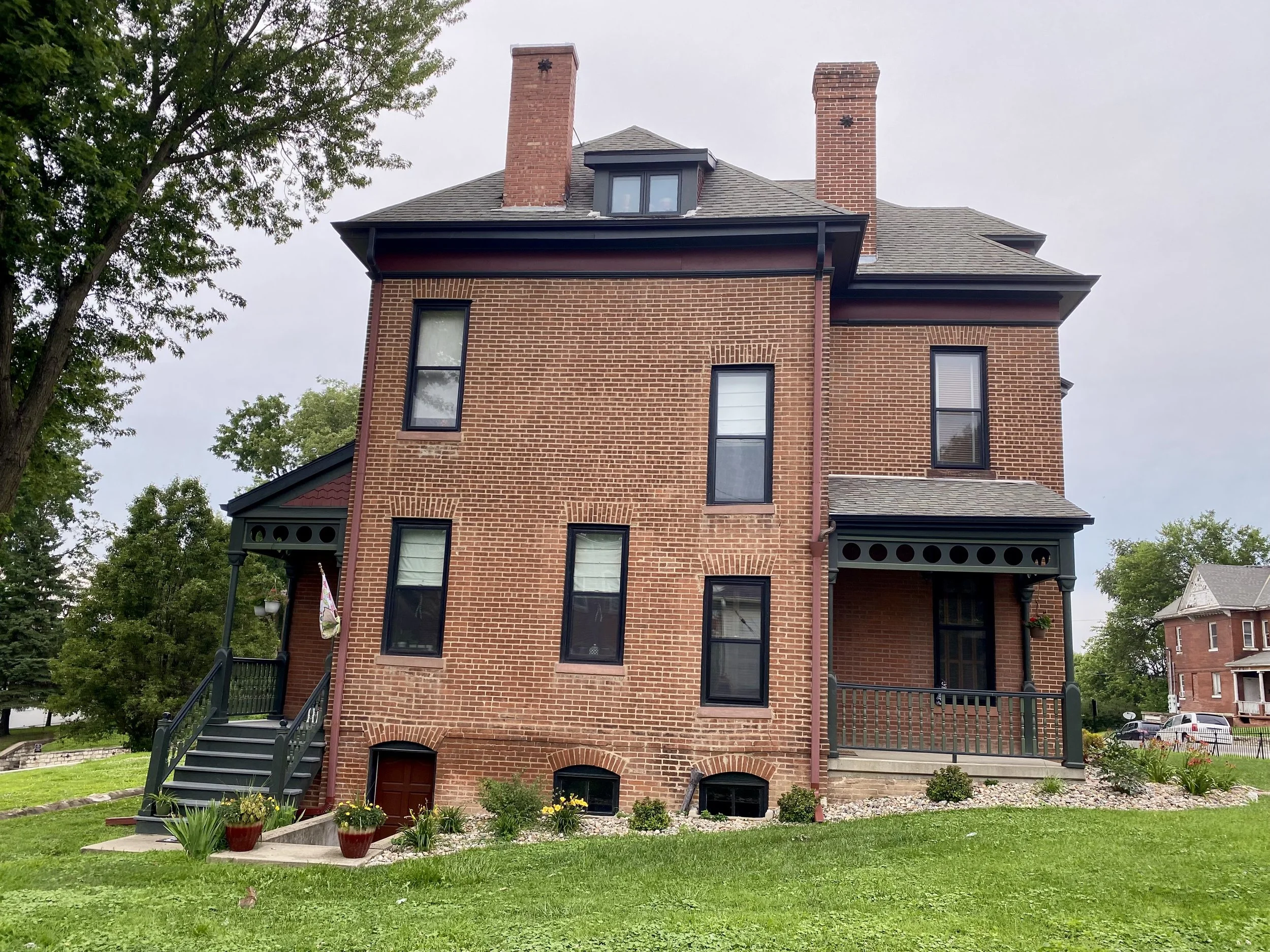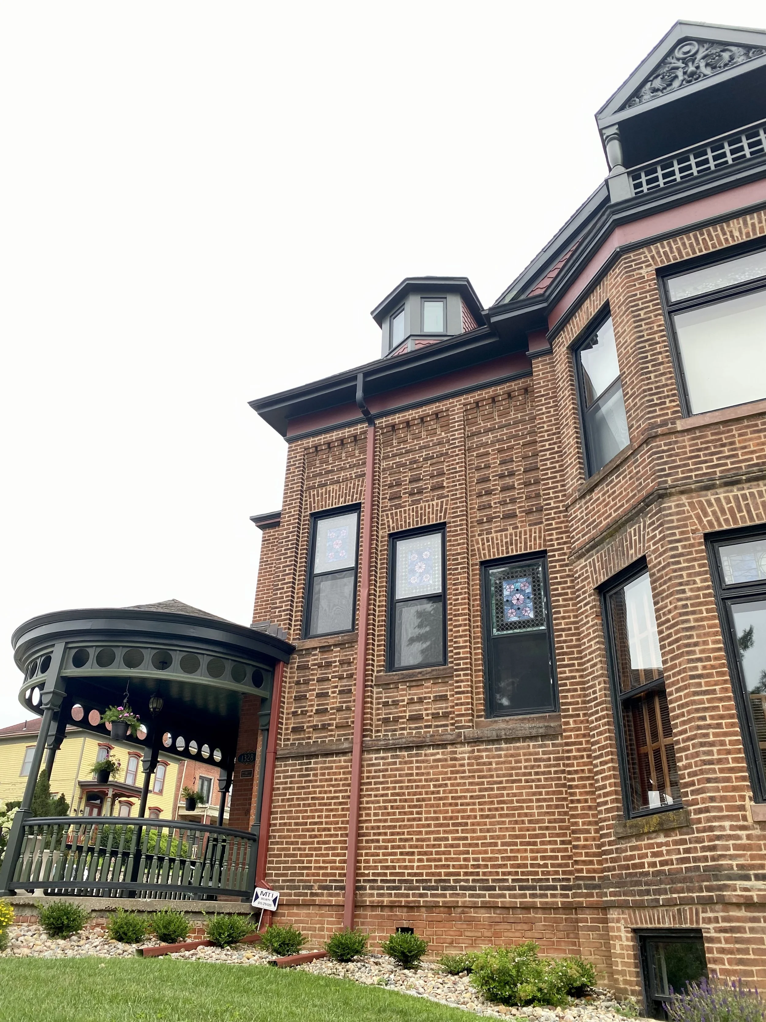 One of the principal architectural features of the house is the exterior treatment of an interior staircase with three stepped stained-glass windows and accompanying brickwork visible on the north side of the home. The west side of the home features a second-floor oriel with curved windows toped with the third-floor balcony that has been reconstructed from the original blueprints.